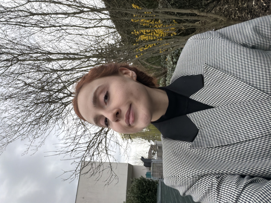 This image depicts a residential outdoor scene, located in the city of Eschau, France. A young adult female, with reddish-brown hair styled back and fair skin, is centrally positioned, looking directly at the camera with a subtle, closed-mouth smile. She wears a black turtleneck sweater beneath a black and white small-checked blazer featuring broad black lapels. A small stud earring is visible in her left earlobe. The background behind her is composed of multiple bare deciduous trees on the right and center, indicative of late winter or early spring. To the far right, a shrub with bright yellow flowers is visible. On the left side of the frame, a modern, multi-story white building is partially visible, behind which a grey structure and a black silhouette resembling a cat are observed. The sky above is overcast.