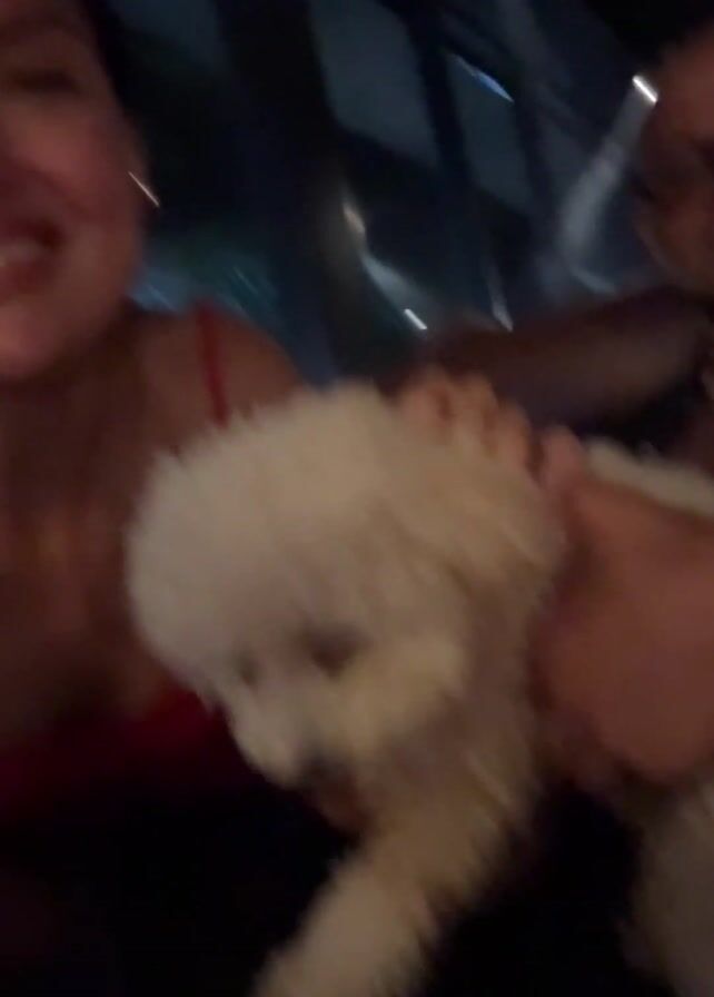 woman holding a small, fluffy white dog. She smiles at the camera, holding the dog close to her face. The dog looks a bit wary, its gaze directed away from the camera. The setting seems to be indoors, possibly in a restaurant or bar, given the dark background, large windows, and overheard lighting.