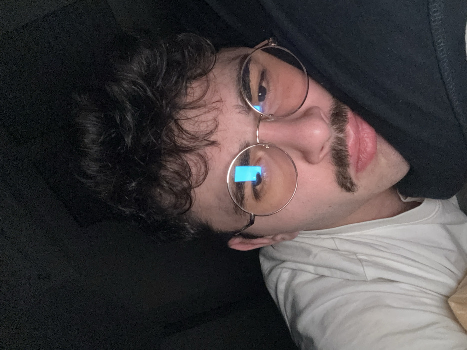A close-up, front-facing portrait of a male individual, appearing to be a young adult, is depicted in a dimly lit, indistinct indoor environment. The subject has dark, curly hair and a prominent dark mustache. He wears round, thin-framed glasses with amber-tinted lenses; a distinct rectangular blue reflection, consistent with a digital screen, is visible in the left lens (viewer's left). His head is slightly tilted, resting against a dark, presumably black, fabric object on the right side of the frame. A white crew-neck garment is visible on the subject's left side. He looks directly at the camera with a subtle pouting expression. The background is uniformly dark and featureless. No visual information within the image identifies its location as Rennes, France, or any specific geographical context.