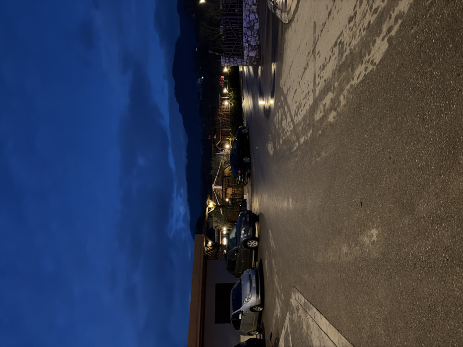A night scene features a wet asphalt road lined with parked cars. Buildings are on the left, with lights illuminating their structures. The road curves slightly. In the distance, a mountain range is visible under a dark blue sky, and additional lights appear along the mountain slope, suggesting a settlement or path. The road surface reflects light.