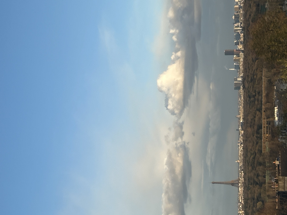 This image presents a wide-angle, elevated panoramic view of the Paris skyline, as observed from Suresnes, France, likely from an elevated point such as Mont Valérien. The upper approximately 60% of the frame is dominated by a sky displaying varied cloud formations; patches of clear light blue are interspersed with scattered cumulus clouds, some brightly illuminated by sunlight, others appearing darker grey. The horizon reveals the distant cityscape of Paris. On the left side, the Eiffel Tower is prominently visible, its lattice structure silhouetted against the sky, rising above the general urban sprawl. To the right of the frame, the modern high-rise buildings of the La Défense business district are identifiable, including a distinct cylindrical tower and another structure emitting a plume, possibly steam, from a tall stack. The area between these iconic landmarks consists of a dense, low-rise urban fabric. In the mid-ground, below the distant cityscape, lies an expansive green area dominated by deciduous trees, largely bare, suggesting either late autumn or winter foliage. This green expanse appears to be a large park or forest (e.g., Bois de Boulogne). Within this treed area, horizontal structures, possibly parts of buildings or infrastructure, are faintly discernible. The immediate foreground shows the tops of residential or urban structures, indicating the viewpoint is from an elevated position within a developed area of Suresnes. No individuals or specific actions are discernible within the frame.