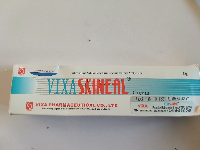 The scene, located in Lokoja, Nigeria, depicts a vertically oriented white rectangular cardboard box for "VIXA SKINEAL Cream" resting on a plain, light-colored surface