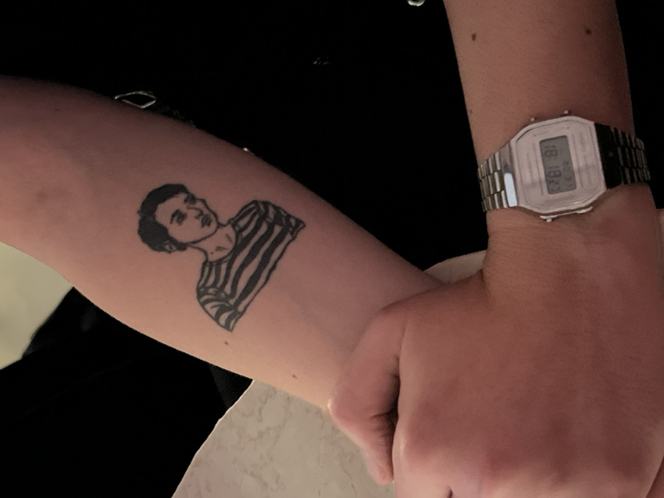 An arm displays a black ink tattoo of a person wearing a striped shirt