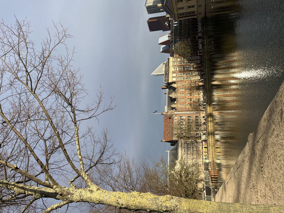 The image displays a panoramic view of the Hofvijver pond in The Hague, Netherlands, under partial sunlight and an overcast sky. In the foreground, positioned on the left, a large deciduous tree with bare branches and substantial yellow-green lichen growth on its trunk and limbs dominates the left side of the frame. A sunlit, unpaved path runs along the bottom left edge. The Hofvijver, a body of water, occupies the central midground, reflecting the sky and buildings from its opposite bank. Along the far bank of the Hofvijver, a series of architectural structures are visible. These include a light-colored building partially encased in scaffolding, followed by a prominent multi-story brick building featuring a red tile roof and a blue flag flying from a flagpole on its façade or an adjacent structure. Other historic buildings of varying designs line this bank. In the background, beyond the historic structures, the city's modern skyline is visible, characterized by several distinct skyscrapers and contemporary architectural forms. Multiple small human figures are discernible walking along the path on the far bank of the Hofvijver. The sky overhead transitions from lighter, clearer areas on the left to darker, denser clouds on the right. Direct sunlight illuminates the foreground path and creates bright reflections on the water's surface, particularly in the mid-right. The bare trees indicate a late autumn, winter, or early spring season.