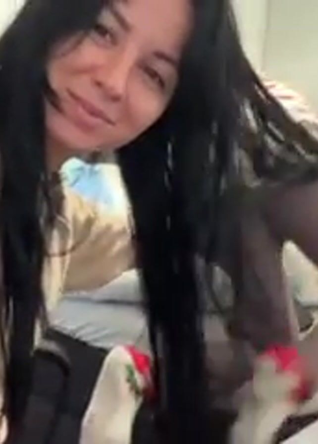 A woman with long, dark hair is facing the camera, sitting at a desk with a computer keyboard visible