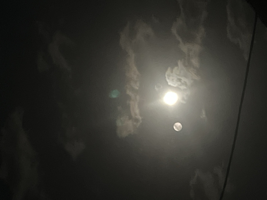 This image captures a nighttime sky over Rido, Nigeria. The scene is dominated by a dark sky interspersed with visible clouds, illuminated from below. Two distinct luminous, circular objects are present; one larger and intensely bright, positioned centrally to the right, and a smaller, less intense luminous circle located to its left. Both objects are partially obscured by wisps of clouds. A faint, greenish lens flare is visible in the upper central portion of the frame. A single, dark, thin linear object, resembling a power line or cable, traverses horizontally across the lower third of the image. No individuals, specific structures, or discernible activities are depicted.