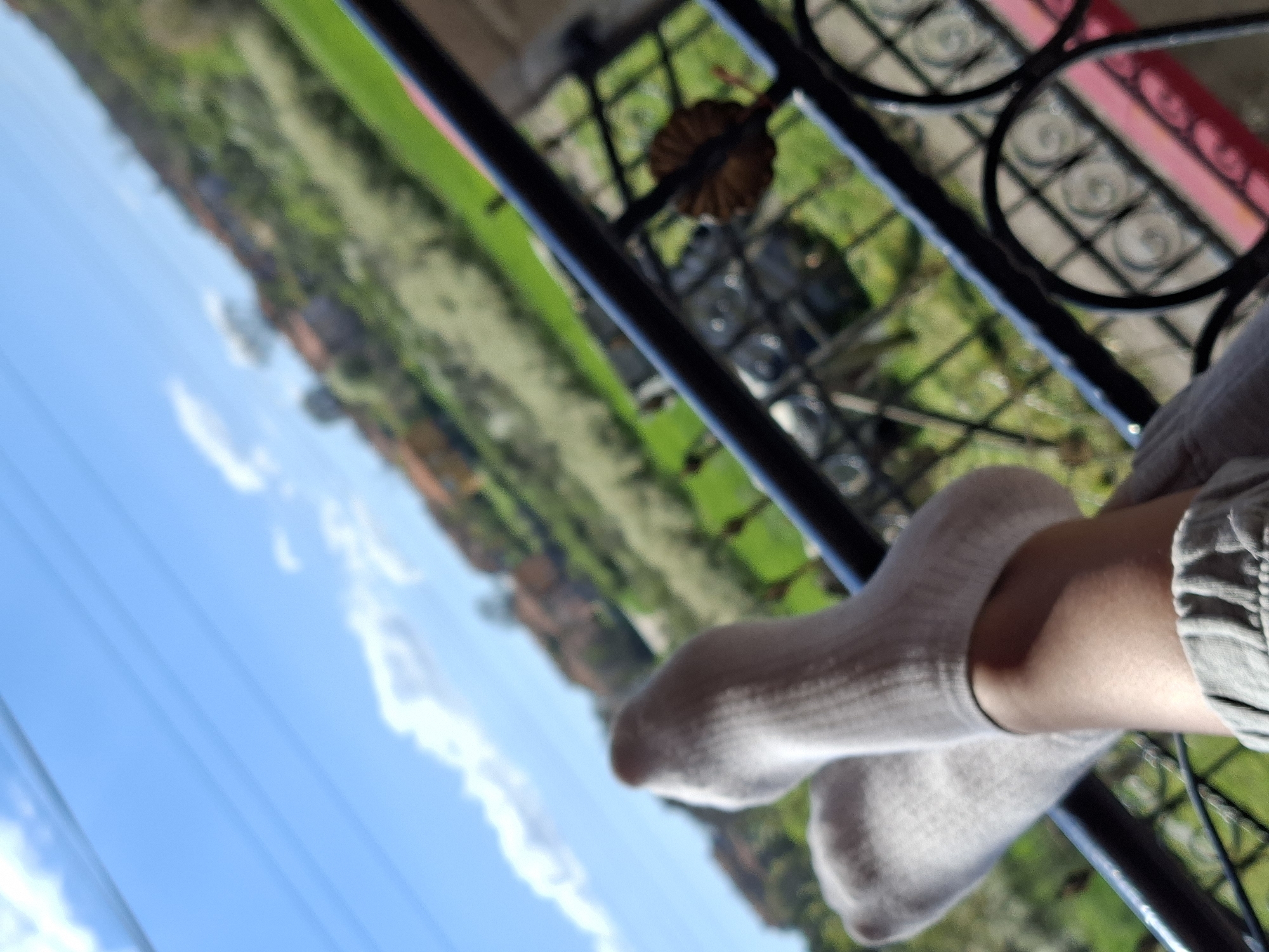 The image depicts a view from a balcony or porch, possibly in Dimitrovgrad, Bulgaria. The perspective is tilted, showing the sky, a distant cityscape or townscape, and greenery. The focus is on a pair of legs crossed, clad in gray socks and trousers, resting on a black metal railing. The railing has a decorative design with circular elements. A small, round, possibly ornamental object is attached to one of the vertical railing supports. The background is out of focus, obscuring the details of the buildings and vegetation.