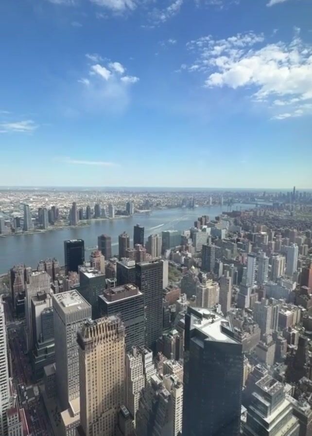 The video presents an aerial view of Manhattan, New York City on a sunny day with blue sky and scattered clouds