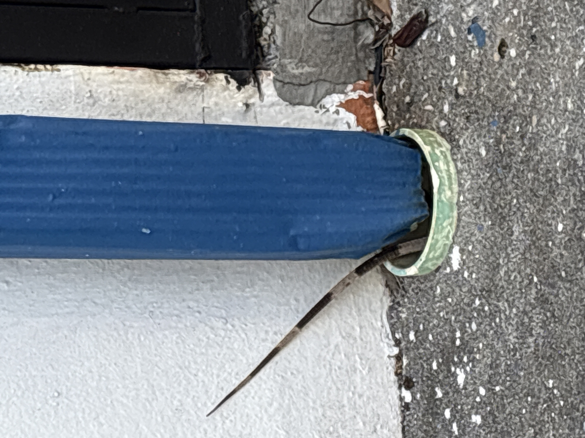 - "A close-up shot captures the end of a blue, ridged metal pipe extending horizontally into a green-rimmed opening in a weathered, white-and-gray cement wall" by FM-4WJah1, licensed under CC BY 4.0