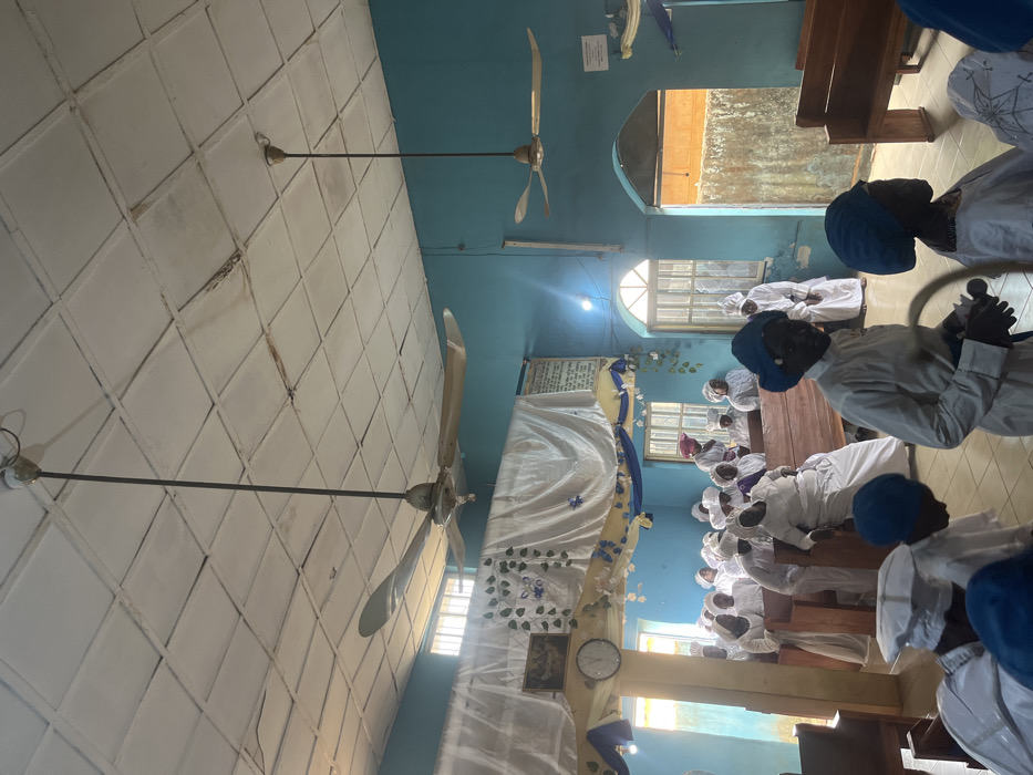 The interior of a building, identified as being in Kuru Dungus, Nigeria, shows a gathering of individuals, predominantly women. The room features light blue walls and an off-white tiled ceiling, portions of which exhibit water damage and discoloration. Two large, two-bladed metallic ceiling fans hang from long rods, positioned towards the center and right side of the room. Bright light enters through multi-paned windows on the left and right, and an arched doorway on the far right which reveals an exterior wall with a textured, orange-brown finish. Decorations include white fabric drapes with blue and white ribbons/bunting, and green leaf-shaped embellishments across the upper left wall. A clock and a framed image are visible behind the drapes, along with a framed text display. Approximately twenty to thirty individuals are visible, with most wearing white robes or dresses and matching white head coverings. Some individuals in the immediate foreground wear blue head coverings with their white robes. Two individuals in the foreground, facing away or slightly to the side, wear blue head coverings and white garments; one on the left holds a dark, cylindrical object. Multiple individuals are seated on light brown wooden pews. One person in a white robe and white head covering is notably leaning forward in a pew in the midground on the left. An individual in the background wears a pink head covering.