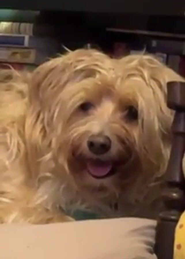 A medium shot depicts a small, light-brown dog with long, shaggy fur resting its head on a neutral-colored pillow