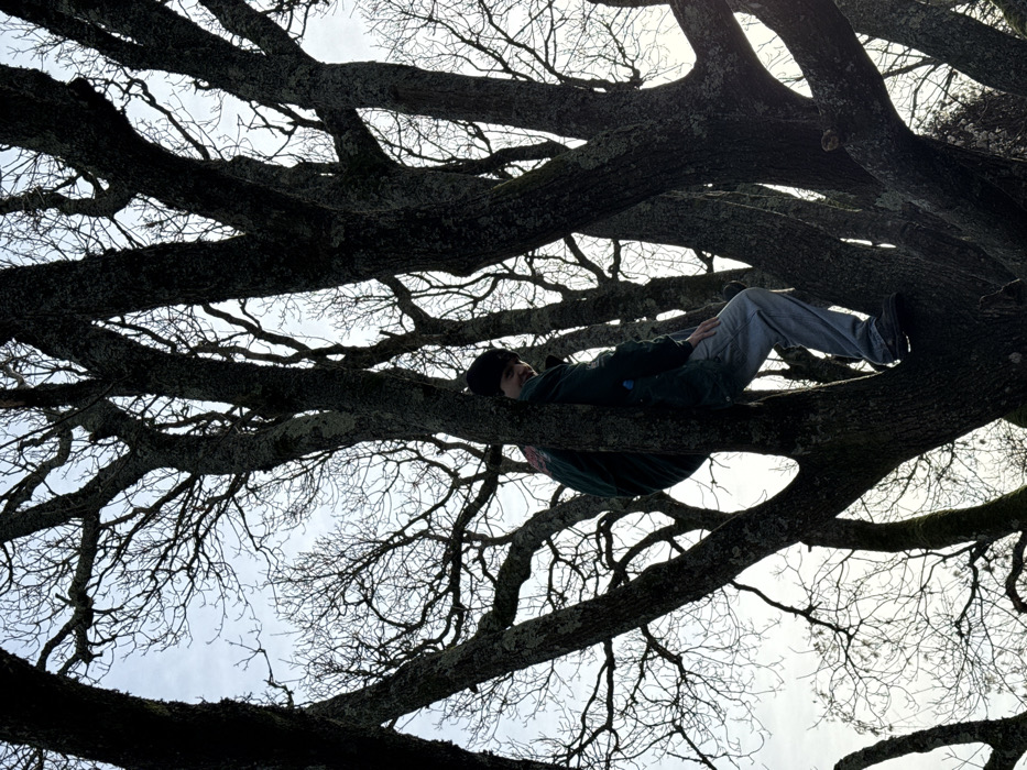A low-angle photograph captures a young male individual seated within the bare, gnarled branches of a large deciduous tree