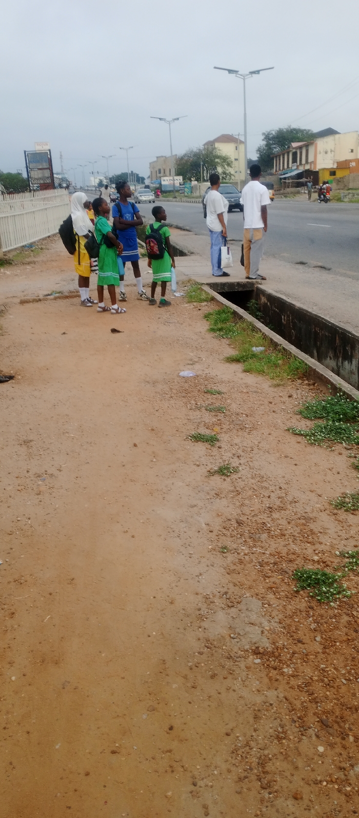 On a dirt path next to a road, a group of students in school uniforms wait near adults. The students wear varied colors, including yellow, green, and blue. Some have backpacks. The adults stand closer to the road's edge. A concrete drainage ditch runs parallel to the road. Cars and a motorcycle are visible on the road in the background, as are buildings and lampposts under a cloudy sky.