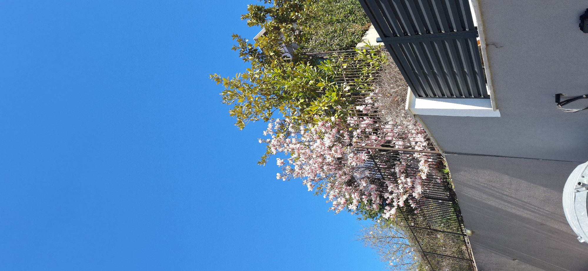 - "view of a bright blue sky, a blooming tree with pink and white flowers, a green tree, a gray building with black window blinds, and a fence" by FM-1mUZ03, licensed under CC BY 4.0