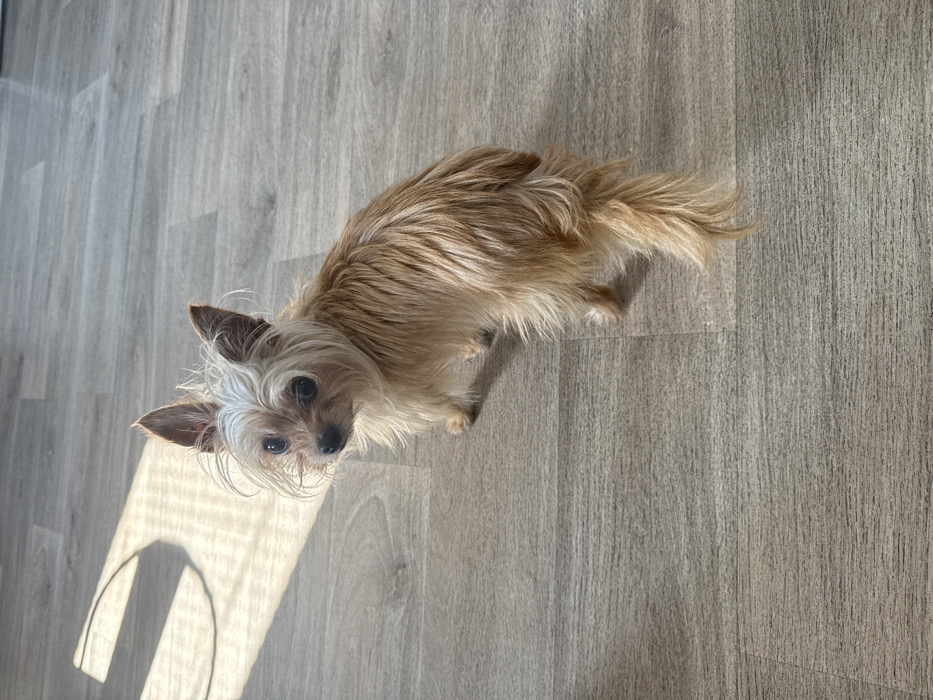 - "An indoor scene in Chantepie, France, depicts a small, long-haired dog with tan and light cream fur standing on a light greyish-brown wood-look laminate floor" by FM-o3Fqy2, licensed under CC BY 4.0