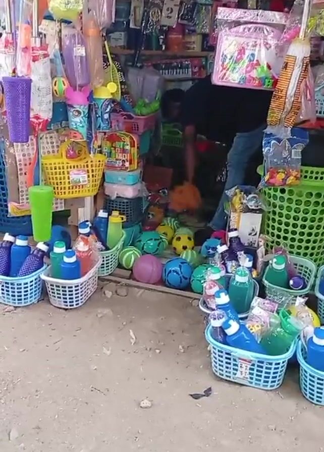 exterior of a small shop. The shop is crammed with various colorful plastic items including containers, water bottles, and balls, which are displayed in baskets and hung from the ceiling. An individual wearing a dark shirt and jeans is rummaging inside the shop. A person wearing a floral shirt walks by in front of the shop. Music is playing in the background. The ground in front of the shop is unpaved.