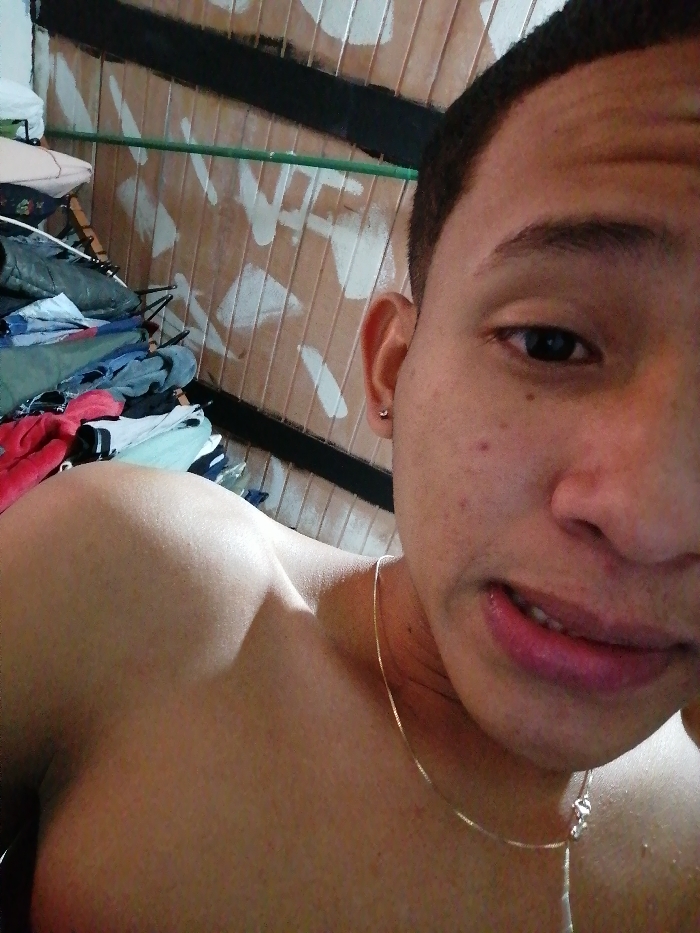 The image depicts an indoor scene within the city of Soacha, Colombia. A single individual, appearing male, is positioned in a close-up, chest-up shot. The person has light brown skin, short dark hair, dark eyes, and a subtle smile with slightly parted lips. A small silver-colored stud earring is visible in the left earlobe, and a thin, light-colored chain necklace is worn around the neck. The individual's left shoulder and upper chest are exposed. In the background, to the left of the individual, is a pile of folded clothing or textiles in various colors including red, blue, green, white, and black. The wall behind the subject is constructed of vertical light brown wooden planks featuring irregular white paint marks or patterns. Two dark horizontal beams and a thin green horizontal rod are visible traversing the background wall. The scene is lit consistently, suggesting an indoor environment.