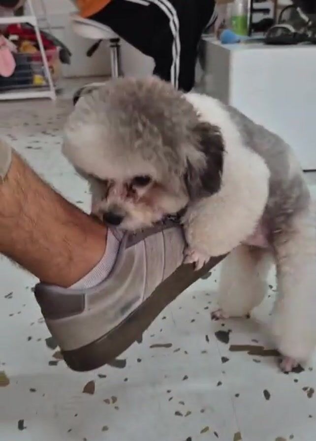 A small dog is seen nuzzling and leaning against a person's leg, which is clad in an Adidas shoe. The dog is predominantly white with gray patches, a fluffy coat, and a haircut that gives it a rounded appearance. It appears to be affectionate or seeking attention. The person whose leg the dog is leaning on is standing. In the background, a person is seated, wearing an orange hoodie and black pants, and appears to be working on someone's foot, suggesting a salon or spa setting. Other details in the background include salon equipment, personal items, and a marbled floor.