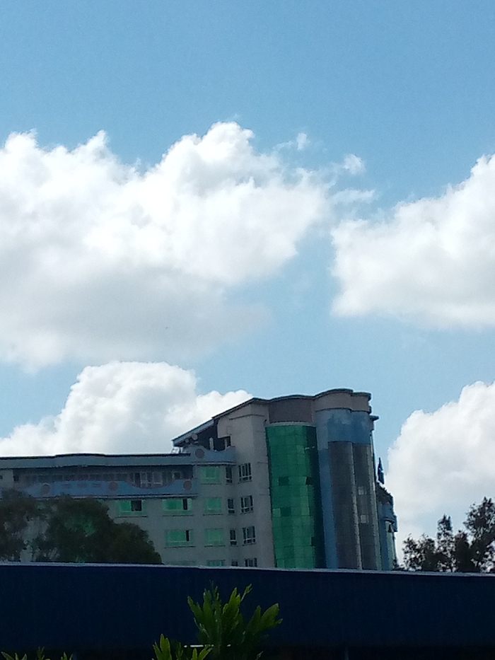 A medium shot depicts a tall, multi-story building with a combination of grey, blue, and green glass facades. The building is set against a backdrop of a vibrant blue sky dotted with fluffy white clouds. Below, dark green foliage partially obscures the lower portion of the building, suggesting a ground-level perspective. The light indicates it is daytime.