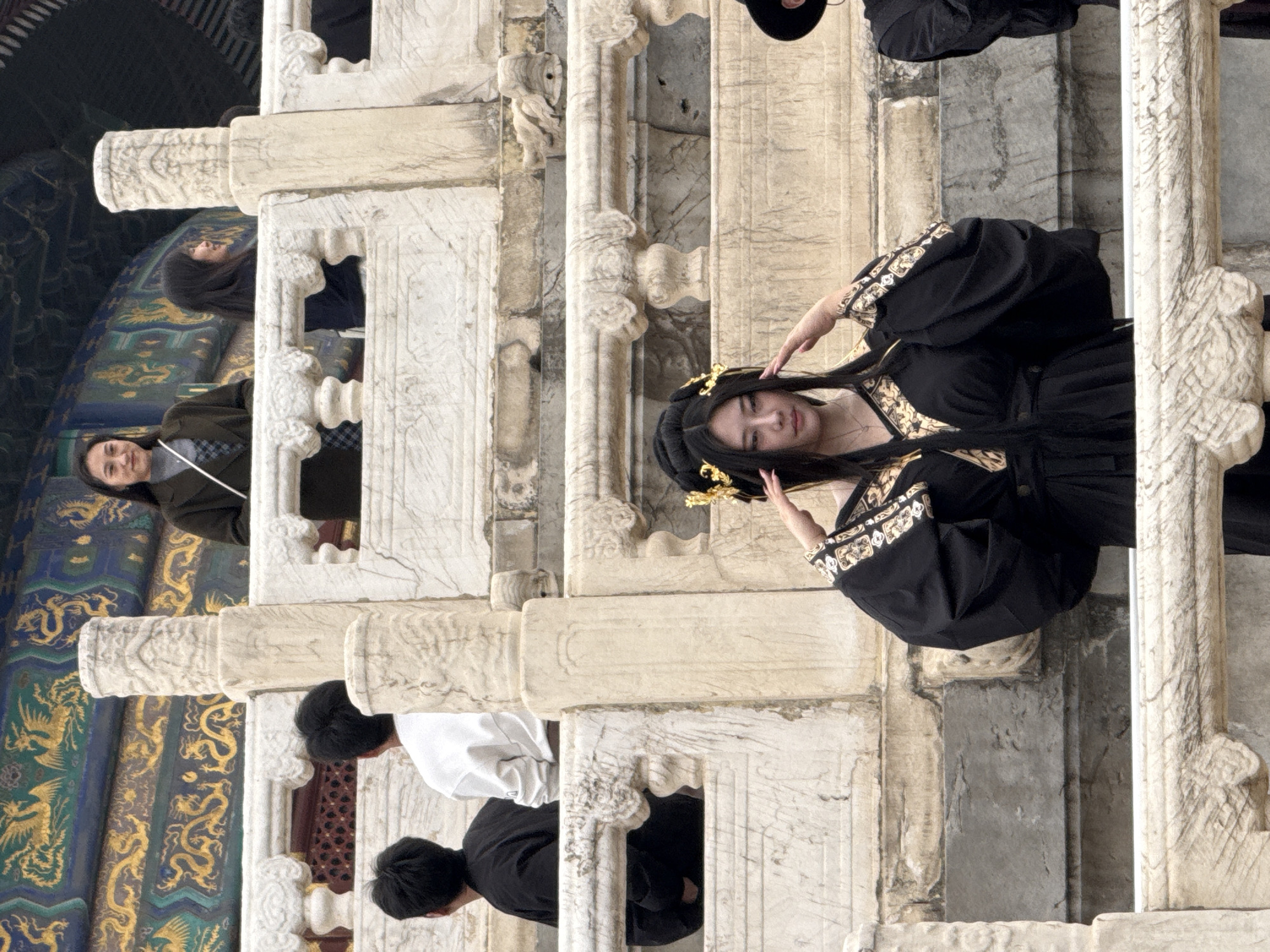 The image displays a multi-tiered architectural complex in the Dongcheng District, China, specifically characterized by white marble balustrades and a traditional building facade. In the immediate foreground, a female individual is centrally positioned, wearing a black traditional Chinese dress with extensive gold embroidery on the sleeves and neckline, and an elaborate dark hairstyle adorned with multiple gold-colored ornaments. She poses with both hands raised near her temples, fingers slightly spread. A partial view of a second individual in dark clothing and a black hat is visible to her right. On the level directly above, separated by a white marble balustrade, two individuals are visible from behind. One wears a white long-sleeved shirt, and the other a black shirt. On the uppermost visible level, behind another marble balustrade, two additional female subjects are present. The left subject wears a dark coat over a grey top with a white shoulder strap and looks towards the viewer with a subtle smile. The right subject, with dark hair, faces left. The background features a segment of a traditional Chinese building, exhibiting a dark blue surface elaborately decorated with gold patterns, including dragons and phoenixes. The structure consists of multiple weathered white marble balustrades with carved posts and ornamental details. The scene is outdoors, under natural light.