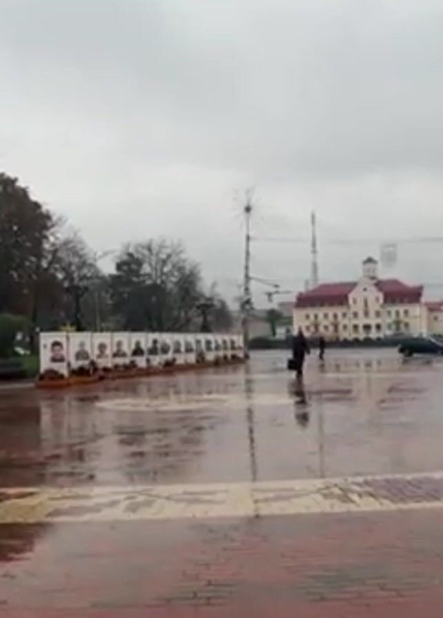 rainy day in a city square. The square is paved with red and white bricks and covered in puddles reflecting the sky. On the left and right sides of the square are rows of large posters with photos of people. The posters are decorated with flowers at the base. In the background, there is a large building with a red roof and a white facade. A Ukrainian coat of arms hangs above the building. A tall antenna is visible behind the building. A person in a dark coat is walking across the square towards the building. A black car is driving on the street in front of the building.