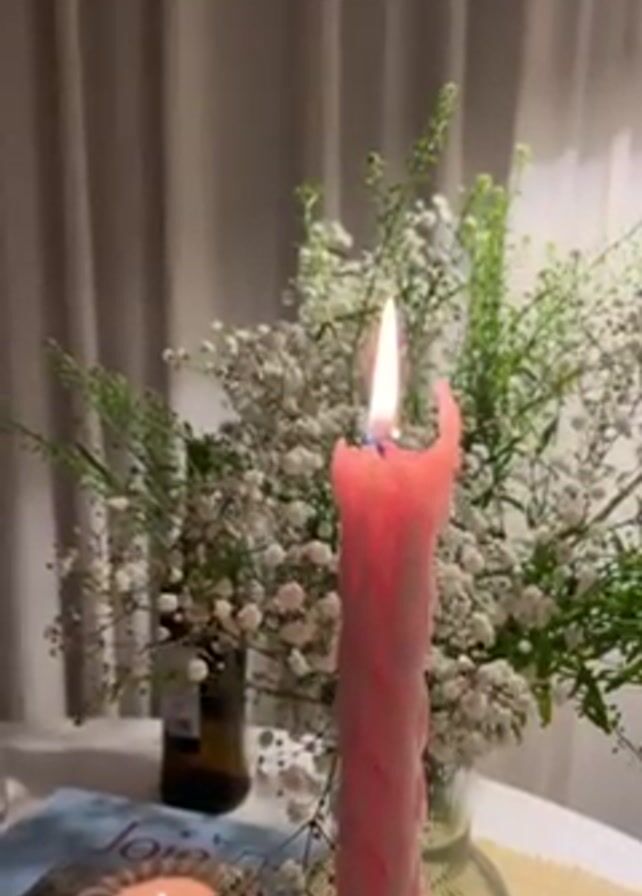 close-up of a table arrangement. The table is covered with a white tablecloth. A tall, pink, twisted candle is burning in the foreground. Behind the pink candle is a vase filled with baby's breath flowers and some green foliage. To the left of the pink candle is a small, lit tea light in a patterned holder and a magazine. The background features a light-colored curtain. A single light fixture is visible in the upper right corner. A brown bottle is also visible behind the vase of flowers.