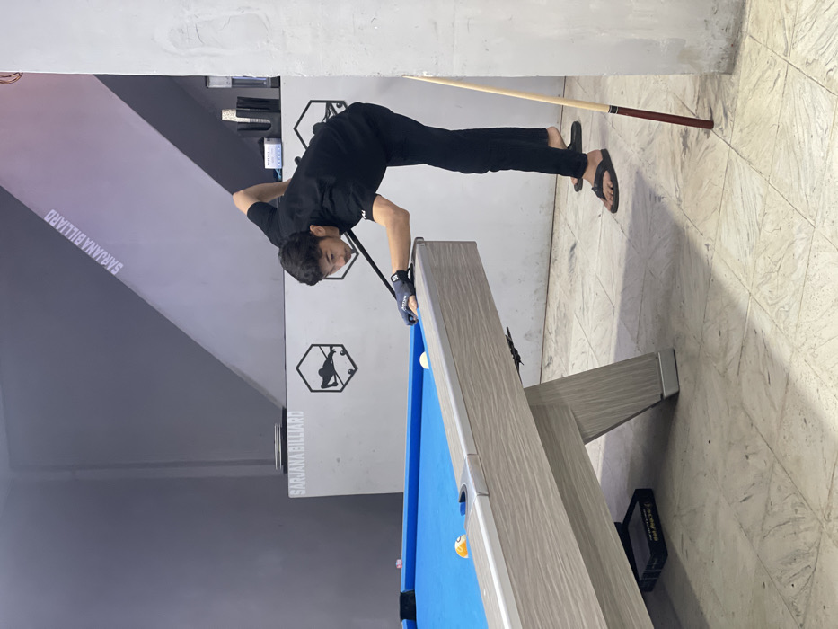 An indoor scene at Sarjana Billiard in Lhokseumawe, Indonesia, features a male individual engaged in a game of billiards