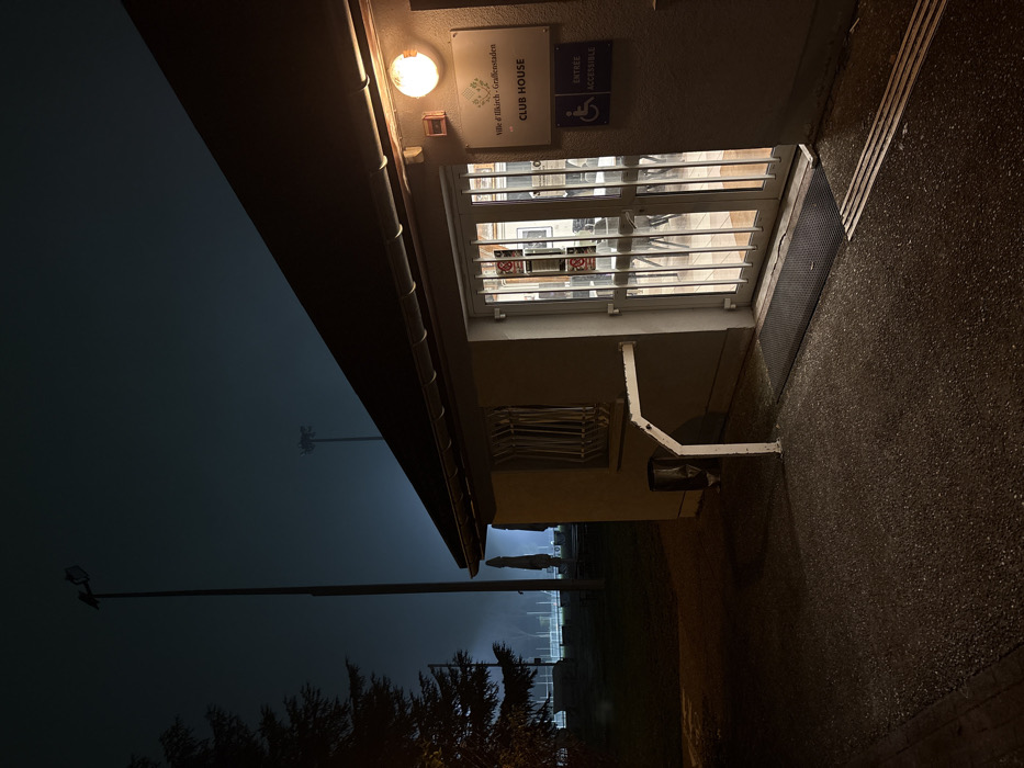 A building with the sign "Club House" is illuminated by an overhead light. A wheelchair-accessible sign is also visible. The entrance has a door with metal bars and a floor mat. Outside, a lamp post illuminates a field, barely visible in the foggy darkness. The scene is a nighttime shot.