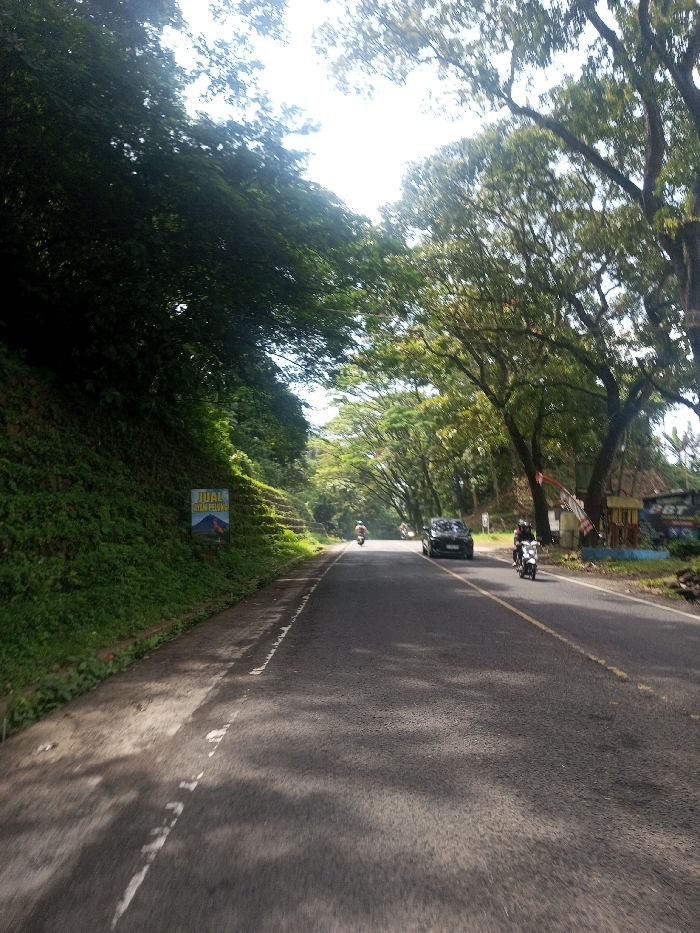 The scene depicts a paved two-lane road in Niz Lakuk, India, under bright daylight. The road surface is dark asphalt with a solid white line marking the left edge and a dashed yellow line separating traffic lanes further right. On the left, a steep, densely vegetated embankment rises, featuring a blue sign with white and yellow text reading "JUAL HEWAN PELIHARAAN" (indicating "PETS FOR SALE" in Indonesian) and an image of a mountain or volcano. The right side of the road is lined with mature trees, forming a canopy overhead. In the mid-distance on the right lane, a dark-colored sedan travels away from the viewer. Closer to the foreground on the right lane, a person on a white motorcycle travels towards the viewer. Further down the road on the left lane, another individual on a light-colored motorcycle is visible, also traveling away. Sunlight filters through the tree canopy, casting dappled shadows across the road surface.