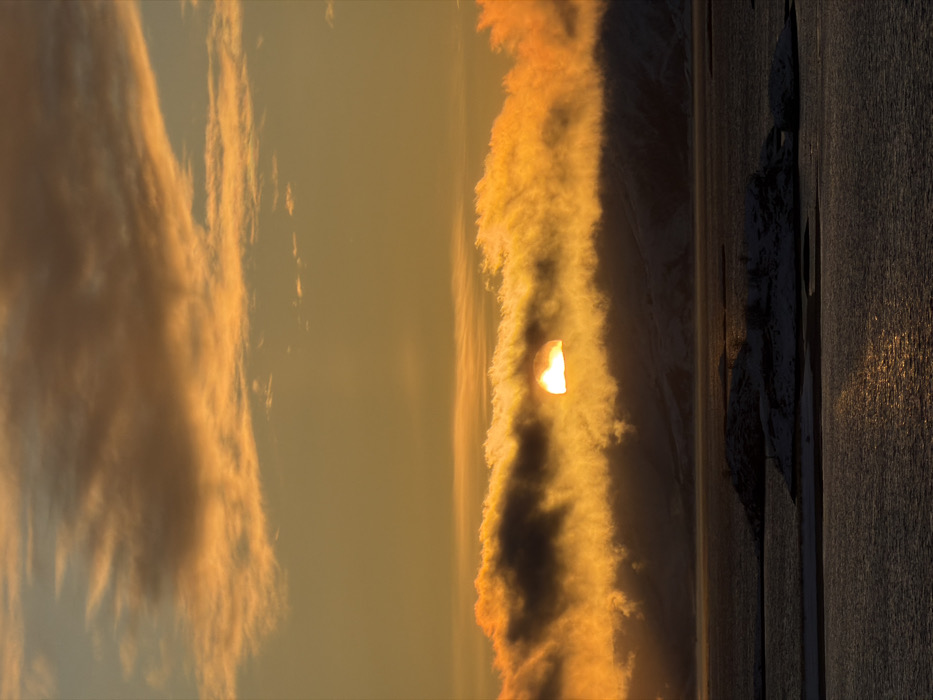 The image displays a panoramic landscape view over a body of water near Tromsø, Norway, during a low-angle sun event, consistent with either sunrise or sunset. The upper approximately two-fifths of the frame features a clear, warm golden-orange sky, with scattered, darker cumulus or stratocumulus clouds across its upper portion. Below this, a thick, horizontal band of clouds, intensely illuminated from behind by the sun, stretches across the mid-section of the image, appearing bright orange and yellow. The sun itself, a brilliant, partially obscured yellow-white semi-circle, is visible through these clouds, positioned slightly left of the image's horizontal center. Beneath the primary cloud band and above the water, the dark, snow-dusted outlines of mountains or large hills are discernible in the distance. The lower two-fifths of the image consists of a calm, dark body of water, likely a fjord or sea. Several small, dark landmasses, appearing as rocky islands or islets with minimal snow cover, are situated in the water, notably in the lower left and extending towards the center. A shimmering, golden reflection of the sun's light extends as a distinct path across the water surface towards the foreground. No human figures, vehicles, or artificial structures are visible within the frame. The overall scene depicts a natural, cold-climate environment.