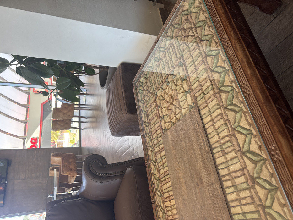 This image depicts the interior of a commercial establishment, likely a cafe or lounge, situated in Ulcinj - Ulqin, Montenegro. The scene is observed from a slightly elevated perspective, looking towards a large window facade. In the immediate foreground, a dark brown wooden coffee table is present, featuring a glass top. Beneath the glass, a mosaic of irregular, light-toned tesserae in shades of beige, light brown, and pale green forms a repeating geometric pattern. A rectangular, dark brown wooden placemat rests diagonally on the glass surface. To the left of the coffee table, a section of a dark brown leather armchair is visible, detailed with brass or silver studding along its armrest. Behind the coffee table and to its right, a dark brown, vertically tufted ottoman is positioned on a light brown herringbone-patterned floor. Adjacent to the ottoman and to the right, a large potted plant with broad, dark green leaves stands next to a white vertical partition or pillar. The background features expansive, angled glass windows that offer a view of the exterior. Through these windows, a red and white building with a prominent "spa" or similar partial text in red is visible. Beyond the windows, a bright, sunny outdoor environment with some foliage is discernable. Within the establishment, beyond the immediate seating area, several light brown upholstered chairs with button tufting are arranged around tables, indicating additional seating. No individuals are present or visible within the frame.