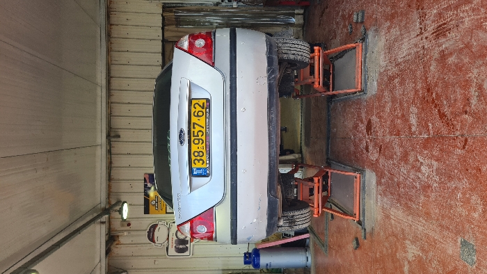 A silver Ford sedan, displaying Israeli license plate 38-957-62, is positioned within an automotive garage in the Mate Asher Regional Council, Israel