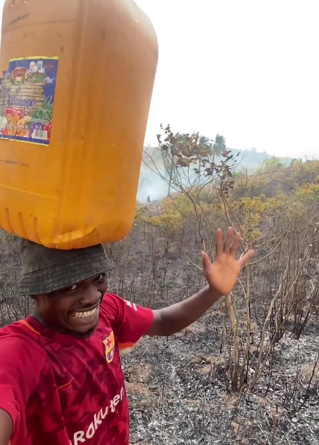A man is carrying a large, yellow plastic container on his head. He's wearing a red Barcelona soccer jersey and a patterned bucket hat. He smiles and waves at the camera as he walks across a field that appears to have recently been burned. The ground is covered in ash and charred vegetation. In the background, there are trees, some of which are still smoking. The sky is overcast.