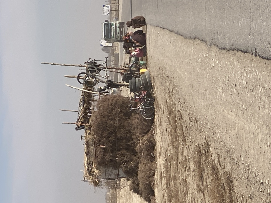 An outdoor scene in Nakhonay, Afghanistan, depicts a roadside environment under a clear, hazy sky. In the mid-ground, a large, cylindrical metal structure is partially obscured by a substantial quantity of dark brown, dried scrub vegetation. Adjacent to this structure is a makeshift shelter constructed from wooden poles, branches, and dried plant material. Leaning against and near the structure are several bicycles, including one with a pink frame, and a stack of multiple used tires. Four individuals are seated or squatting on the dirt shoulder next to a paved road. One individual wears a pink top, while the others are in darker, earth-toned garments. A yellow container and a green bottle are visible on the ground near them. In the background, a white and green commercial truck moves away on the paved road, with multiple road signs and concrete barriers visible further along the roadside. The overall environment is arid and dusty.