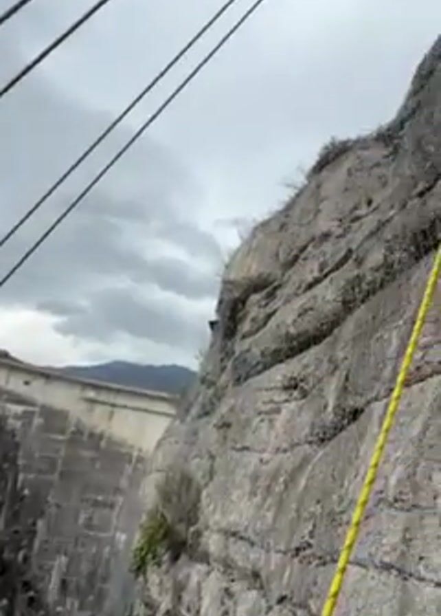 point-of-view shot of a person engaged in a climbing activity near a large concrete dam structure in a rocky, mountainous area. The scene starts with a wide shot of the dam structure, then the camera angle shifts upward to focus on the rocky cliff face. Climbing ropes are visible, anchored to the rock face with metal fixtures. The camera seems to be attached to the climber, following their movement as they navigate the rocky terrain. Vegetation, including small bushes and trees, grows on the cliffside. A deep canyon or valley stretches out below, with a river or body of water visible at the bottom. The weather appears cloudy and overcast. Overall, the video depicts a challenging outdoor climbing activity in a natural setting, with the imposing presence of the dam structure in the background.