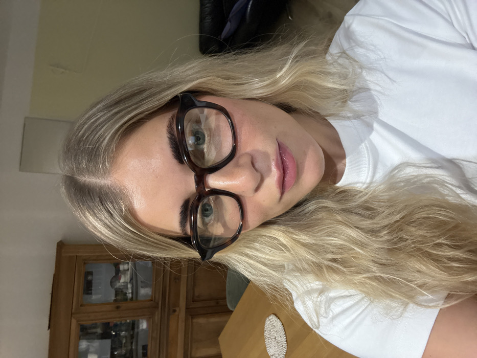 A woman with long blonde hair and brown-rimmed glasses is the focus