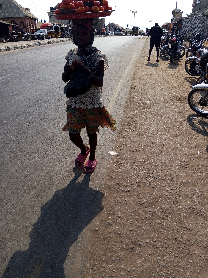 The image captures a sunny street scene in Zango-ndaji, Nigeria. In the foreground, a young person, appearing to be a girl, stands on the edge of an asphalt road, balancing a round, flat metal tray overflowing with red tomatoes on her head. She wears a dark head covering, a patterned scarf, a light-colored, possibly crocheted or lace short-sleeved top, a floral-patterned ruffled skirt, and pink slide sandals. Her hands are positioned at chest level, holding a dark plastic bag. Long, distinct shadows extend from her onto the asphalt. To the right of the asphalt road, an unpaved, dusty shoulder is visible, populated by several parked motorcycles. Further down this shoulder, a dark-clad individual walks away from the viewer. The background reveals an active urban environment with a wide asphalt road stretching into the distance. Various vehicles are present, including a white car, a yellow tricycle (Keke Napep), and other automobiles. Buildings with different roof types, including one with a dark, gabled roof and others with corrugated metal, line the street, interspersed with power poles and streetlights.