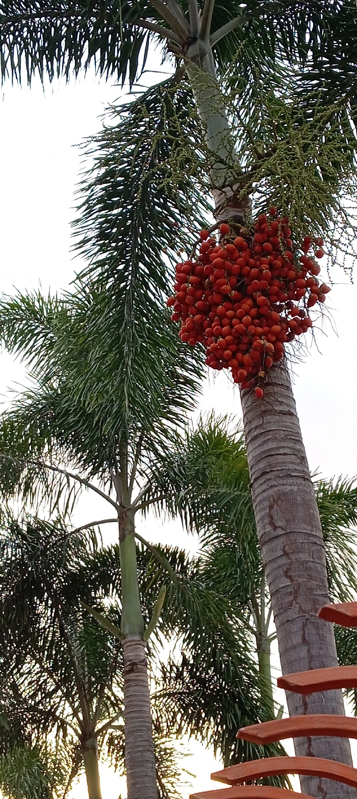 - "The image displays a detailed, upward view of a palm tree featuring a large, dense cluster of bright red, ovoid fruits, located in El Mogote, Venezuela" by FM-DhFfC2, licensed under CC BY 4.0