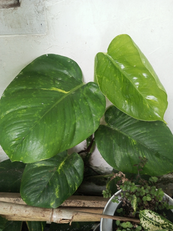 The scene captures a close-up view of vegetation against a light-colored wall, located in Khammam, India. The primary subject is a large, leafy plant, identified as *Epipremnum aureum* (Pothos), characterized by its multiple glossy, heart-shaped green leaves with distinct yellow variegation. Several leaves are visible, appearing generally healthy with some minor surface marks. The plant's stems and root structures are observed adhering to or positioned against a textured, off-white wall that exhibits minor discoloration and some areas of surface wear or slight damage. In the lower right quadrant of the image, a white cylindrical pot contains smaller green foliage plants. One plant within the pot features numerous tiny, rounded green leaves, while another exhibits larger, ovate leaves with prominent green and white/cream variegation. Extending horizontally across the lower mid-ground are several light brown bamboo sticks, forming part of a support structure or barrier. The lighting is natural and diffused, suggesting ambient outdoor or brightly lit indoor conditions. No human figures or active interactions are present. The specific location within Khammam is not visually discernible from the image content.