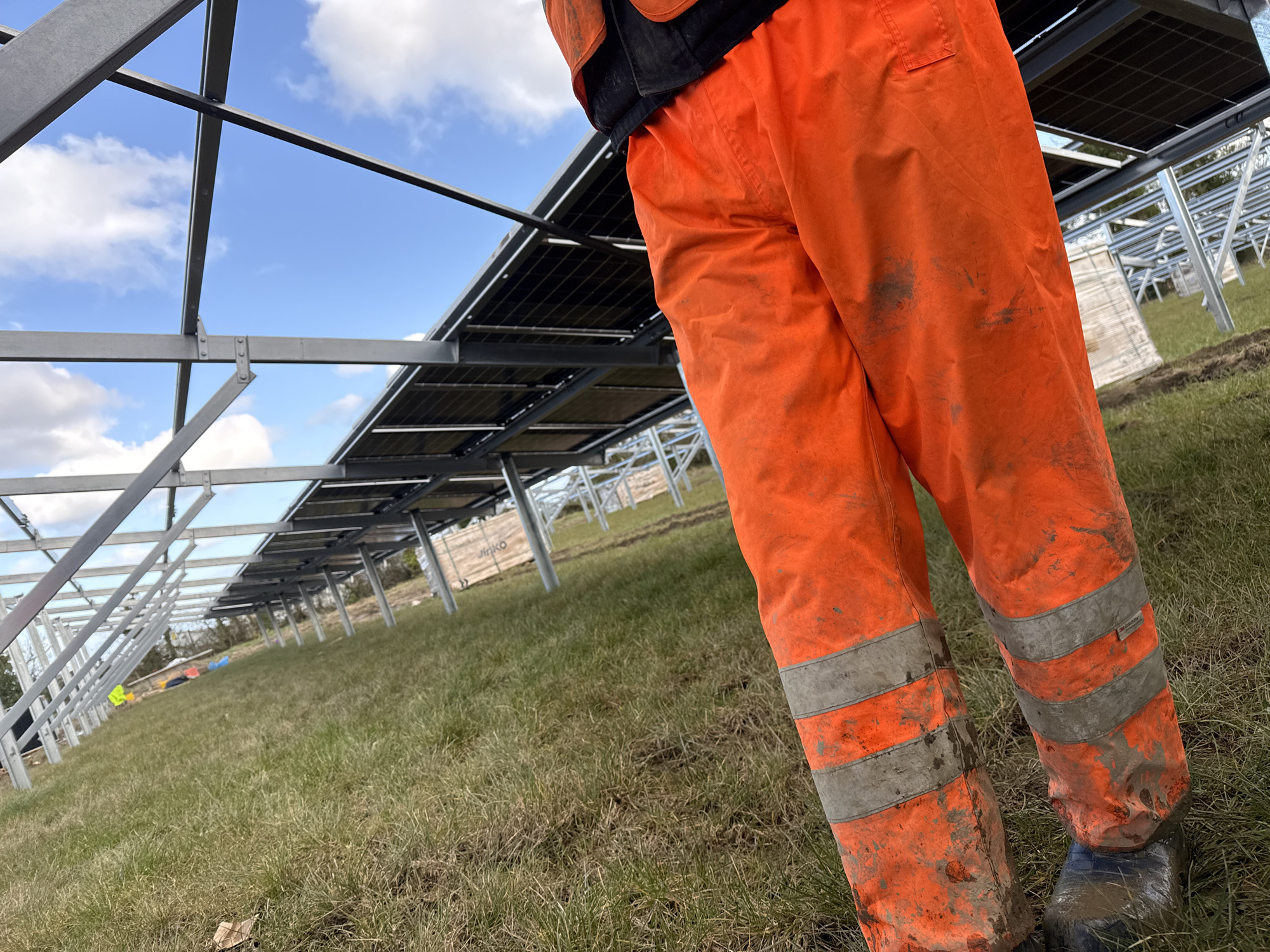 The image captures an outdoor construction site for a solar farm in Baldurgan Hill, Ireland. In the foreground, the lower body of an individual, from the mid-torso down, is visible, facing away from the camera. This individual wears soiled orange high-visibility work trousers with two horizontal silver-grey reflective stripes on each leg, and dark, muddy footwear. A black garment is visible beneath an orange upper-body garment. The individual stands on a grassy field with patches of dry or sparse vegetation. Extending into the middle ground and background are numerous parallel rows of partially installed solar panel arrays. These arrays consist of galvanized metallic frameworks, some of which are fully constructed and hold multiple black photovoltaic panels. Other frameworks appear to be incomplete structures awaiting panel installation. The sky above is clear blue with scattered white cumulus clouds. In the distant background, wooden crates, some wrapped in white protective material, are visible; one crate bears the "JINKO" brand label. Additional metallic frameworks and small, brightly colored objects are visible on the ground beneath the structures further down the field.