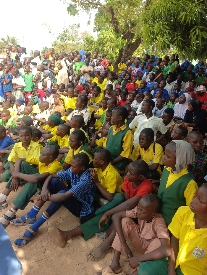 A large gathering of over one hundred individuals, predominantly school-aged children and young adults, is depicted outdoors in Akwanga, Nigeria