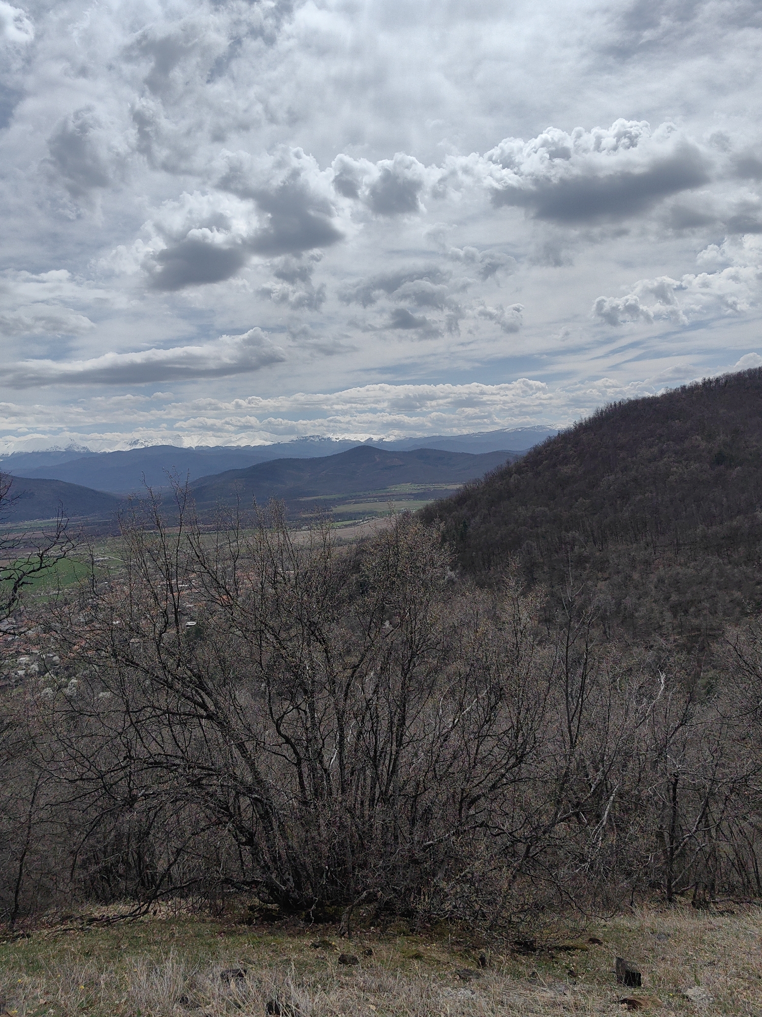 The image depicts a landscape in Vrabevo, Bulgaria. The foreground features dry grass and a dense thicket of bare trees. In the middle ground, there is a valley with a view of buildings of Vrabevo and cultivated fields, fading into a series of rolling hills. In the background, a range of mountains with snow-capped peaks is visible under a sky filled with numerous white and grey clouds. The overall atmosphere is overcast and cool.