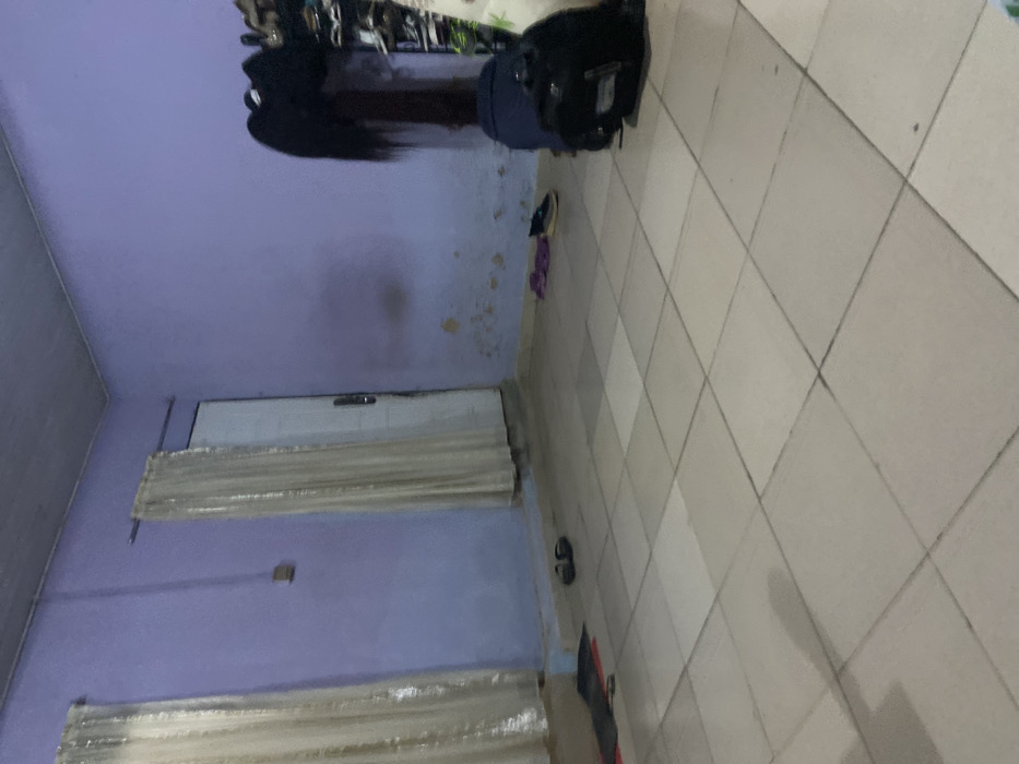 A room with pale purple walls and tiled floors. A closed metal security shutter is on the wall. Below the shutter, a half-drawn curtain partially covers the wall. A backpack and some shoes rest near the wall's edge with the floor. More shoes are on a shelf out of focus in the background. The camera angle is tilted, giving a slightly disoriented perspective. The room appears spare and functional.