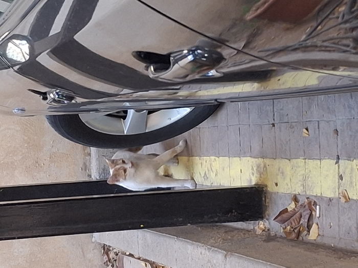 The scene is an outdoor setting within Kafr Sousa Municipality, Syria. A medium-sized domestic cat, predominantly white with light orange markings on its head and tail, stands on a tiled sidewalk. The cat is positioned in the middle ground, facing slightly to its right, with its head lowered and gaze directed downwards. Its front right leg is extended forward. To the immediate left of the cat is a vertical black pole, approximately two-thirds the height of the frame. To the right of the cat, and extending along the right side of the image, is the dark grey or black body of a parked vehicle, possibly a sedan, with a portion of its front wheel visible. The car's surface reflects striped patterns. The sidewalk features grey rectangular tiles with a prominent yellow stripe painted down its center, running parallel to the car and the black pole. To the left of the black pole, a raised concrete curb is visible, beyond which is an earth-toned wall or building facade. Scattered brown and yellow dried leaves, along with two cigarette butts, are present on the sidewalk near the base of the black pole.