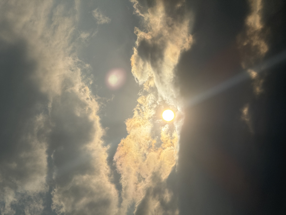 The image displays a sky filled with multiple layers of clouds over Diên Khánh, Vietnam. A circular, intensely bright yellow-white sun is visible in the mid-left portion, partially obscured by dense, dark grey clouds. Golden-orange sunlight illuminates the edges and upper sections of several cloud formations. A distinct, wide beam of sunlight projects diagonally downwards from the sun through a break in the clouds. In the upper right quadrant, a spherical, magenta-hued lens flare is present. No terrestrial features, human figures, or man-made objects are visible within the frame; the scene is exclusively of the sky.