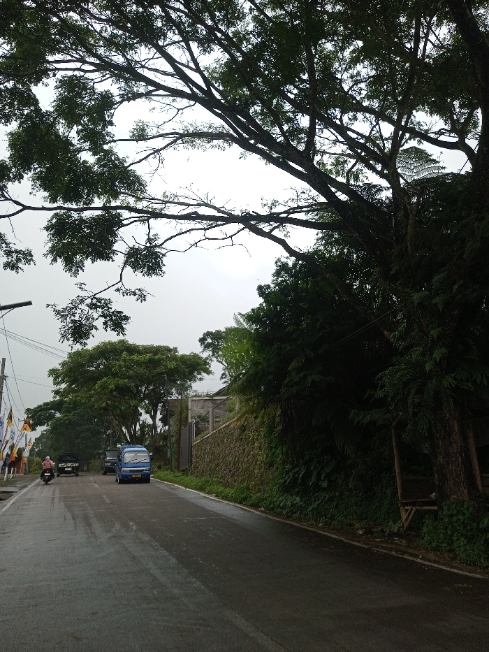 The image displays a two-lane asphalt road in Ambakirano, Madagascar, under an overcast sky. The road surface is wet, suggesting recent precipitation. Large, dense-leafed trees with visible branches dominate the upper frame from both the left and right. On the right side of the road, a moss-covered stone retaining wall supports an elevated embankment, behind which part of a building is visible. A rustic wooden structure, resembling a small stall, is situated against a large tree trunk on the far right. On the road itself, a blue mini-truck is observed driving towards the viewer, positioned in the center. In the opposite direction, traveling away from the viewer on the left lane, a person on a dark scooter, wearing light-colored clothing and a helmet, is visible. Behind the scooter, a dark pickup truck is followed by another dark vehicle in the distance. The left roadside features a utility pole and several white and yellow/orange flags or banners attached to a roadside structure.