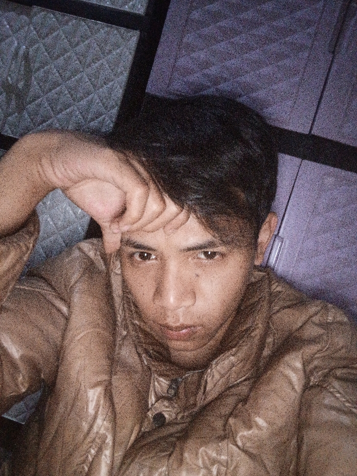 An image, stated to be from Pacet, Indonesia, depicts a male individual in a close-up, chest-up view, appearing to be taken indoors. The subject has dark hair and brown eyes, looking directly into the camera. He is wearing a light brown or tan, shiny, possibly padded or waterproof jacket with a zippered high collar. The individual's right hand (viewer's left) is positioned with fingers curled and resting against his forehead and hairline. The background features a dark, gridded or framed surface with a diamond or quilted pattern on the upper left, adjacent to a plain, solid purple surface on the upper right. The image exhibits significant visual noise or grain.