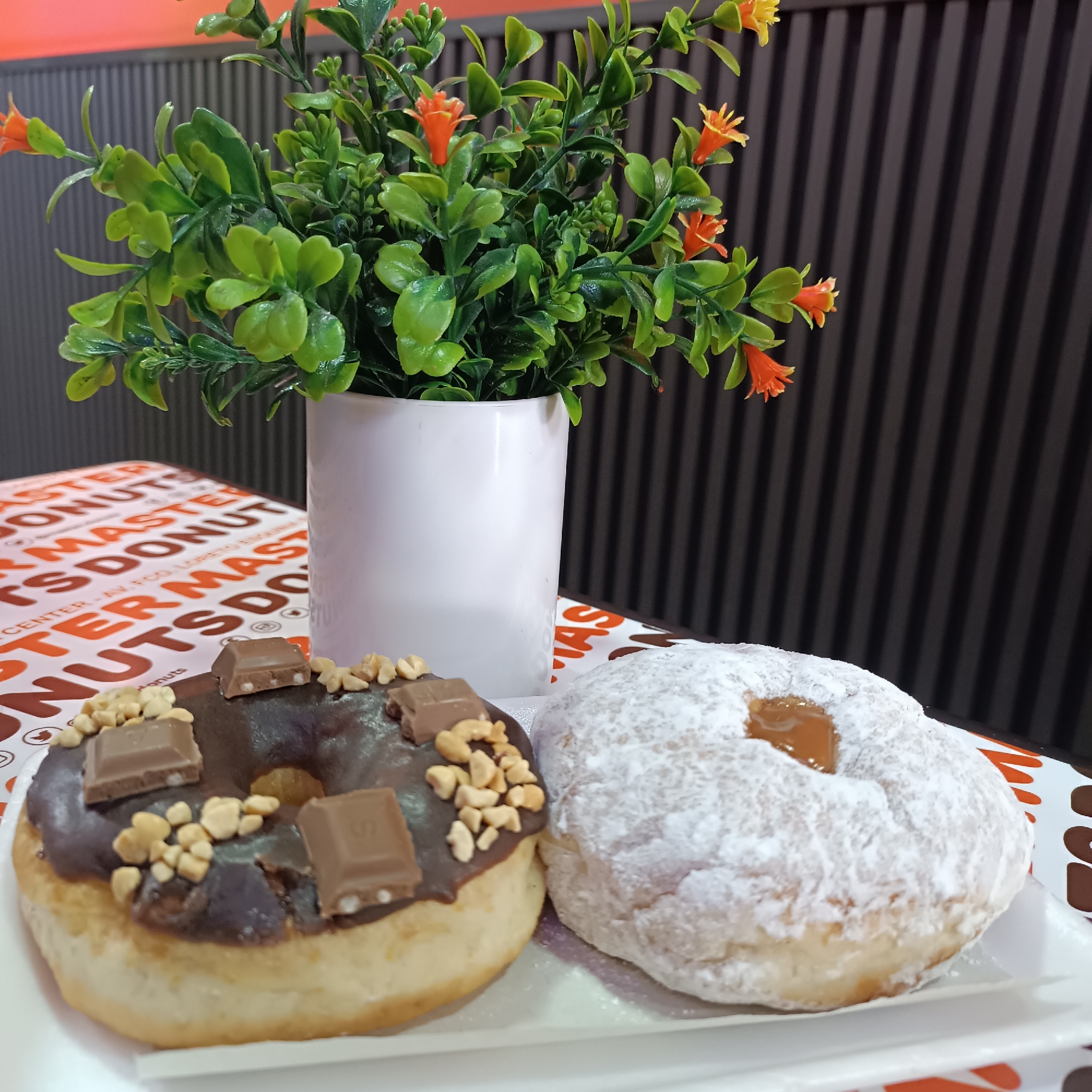 - "The image depicts two donuts displayed on a white rectangular plate, situated on a paper placemat with repeating "MISTER DONUT" branding" by FM-mV6Ik2, licensed under CC BY 4.0