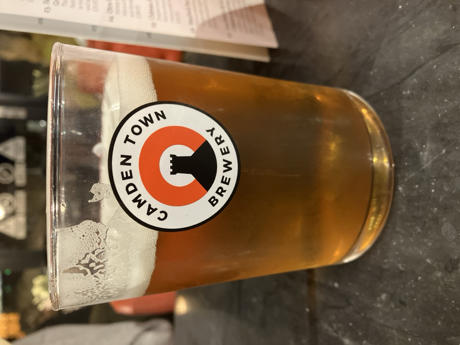A clear pint glass containing an amber-colored alcoholic beverage, topped with a white foam head, rests on a dark, speckled surface. The glass features a circular white sticker with an orange inner ring, depicting a black silhouette of a crenellated tower. The text "CAMDEN TOWN BREWERY" is printed in black around the orange circle. Foam residue clings to the interior upper rim of the glass, suggesting partial consumption. The background is out of focus, revealing a white menu with blurred text on the right side and indistinct dark shapes, possibly including warning-like symbols, and a blurry reddish-orange object towards the left. The scene is located within a commercial establishment, such as a pub or restaurant, in Windermere, United Kingdom. No individuals are visible within the frame.