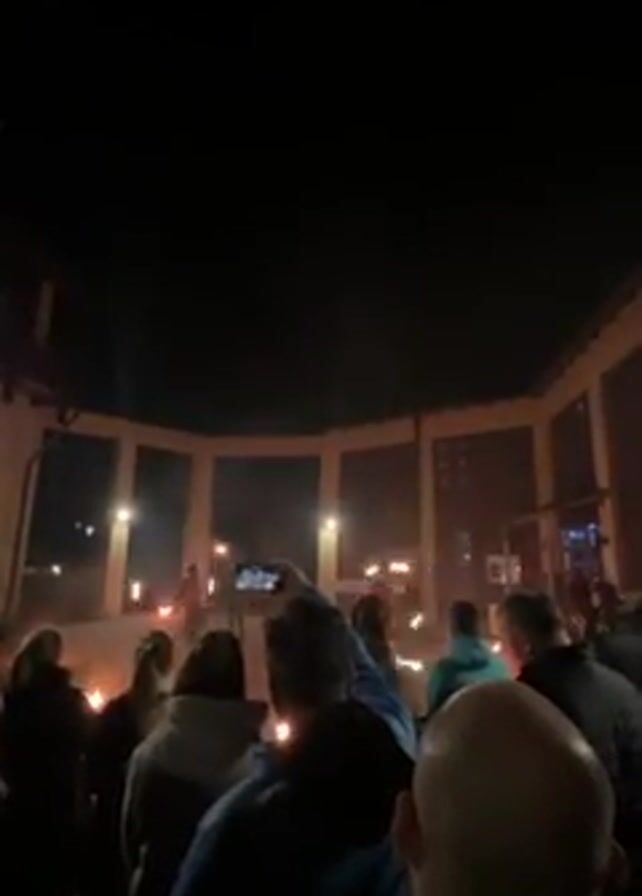 A fire dancing performance is underway outdoors at night, surrounded by a crowd. The performance is taking place in a courtyard, enclosed on three sides by a building with a series of arched openings supported by columns. Light fixtures are attached to the building. Two fire dancers, each with two flaming torches, are performing in the center of the courtyard, swirling and twirling the torches. A crowd of about 20 people watch the performance. Many of them are holding up phones, recording the show. The night sky is dark.